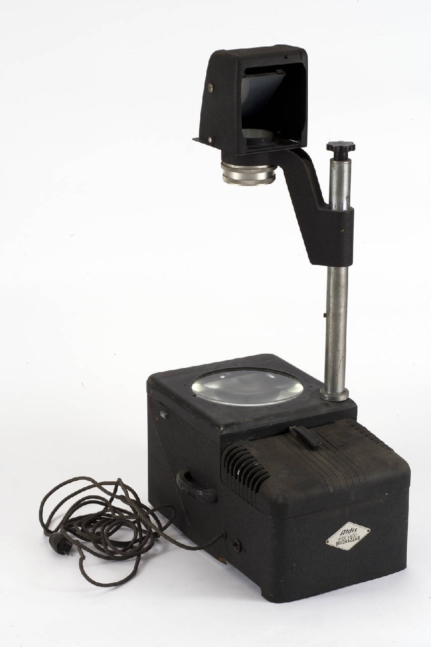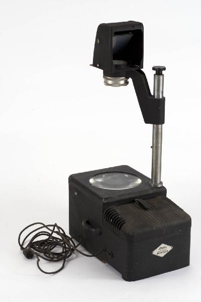 Questo dispositivo è costituito da una base in metallo e una parte superiore ad esso collegata mediante un'asta in metallo.\nNella base è contenuto l'apparto di illuminazione costituito da due corpi separati. Nel primo si ha una lampada con cappuccio in metallo e specchio concavo, inserita in un porta lampada collegato ad un cavo elettrico per il collegamento alla rete di alimentazione e all'interruttore di accensione/spegnimento. Davanti alla lampada si ha un vetro trasparente. Questa parte è chiusa da un coperchio in metallo. Nell'altra parte della base si hanno una lente condensatrice in corrispondenza del punto da cui arriva il fascio di luce della lampada, uno specchio inclinato a 45° che proietta il fascio di luce sulla superficie superiore in metallo ma con una grossa lente in vetro al centro.\nA questa parte della base è fissata l'asta verticale sulla quale può scorrere un portaobiettivo con obiettivo Aldis 35cm. La possibilità di regolare l'altezza rende possibile la messa a fuoco dell'immagine. Sopra l'obiettivo si ha uno specchio inclinato di 45° per la proiezione in orizzontale dell'immagine.\nLateralmente sono presenti due incastri sporgenti per il fissaggio degli accessori contenenti i supporti da proiettare.