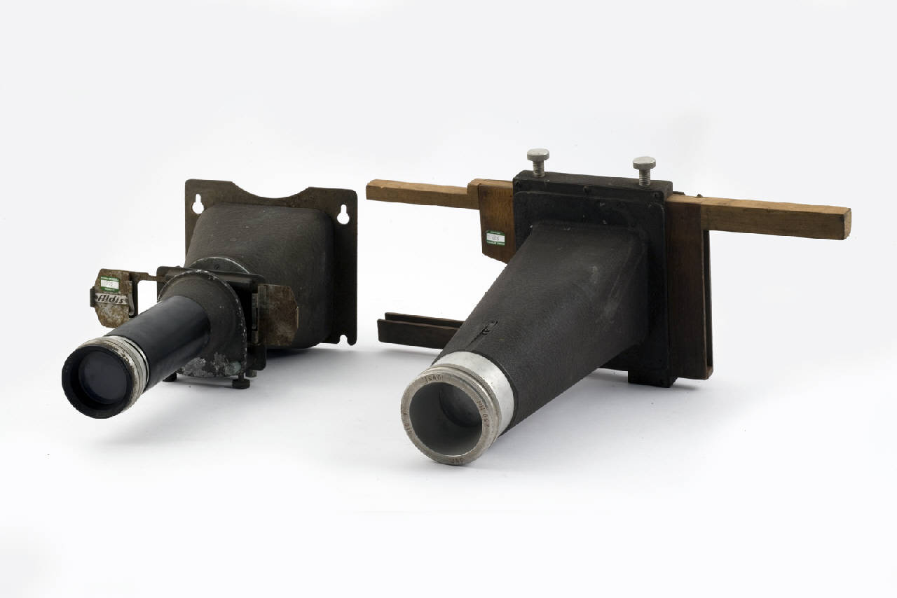 Due obiettivi per epidiascopio. Il più piccolo, un Aldis 150mm f/3.2, di forma piramidale è interrotto a metà da un telaio nel quale si inseriscono fino a due diapositive formato 24x36mm da proiettare. L'altro, un \nAldis Uno f=250mm con un telaio in legno per positivi trasparenti di formato 12x12cm.