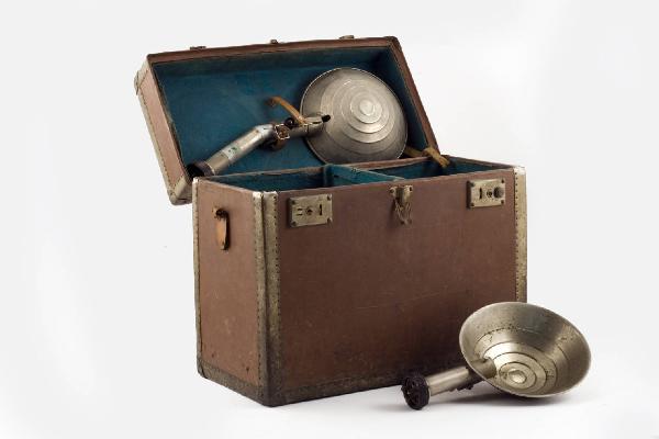 Valigia in legno ricoperta esternamente in pelle marrone e internamente in velluto verde. Con coperchio apribile, serrature e maniglia in cuoio.\nAll'interno della valigia si ha un apparecchio fotografico Jhagee, due magazzini portalastre, un fotometro, un otturatore a tendina con contenitore, due supporti per flash a lampada.\nL'apparecchio fotografico a lastre è in legno e metallo con un grosso obiettivo che occupa tutta la parete anteriore.\nE' possibile la regolazione della messa a fuoco agendo su una leva sporgente e la tacca indicatrice permette la lettura su una scala lineare posta sopra l'obiettivo. Questa scala è costituita da un tubo in ferro a sezione triangolare che può ruotare attorno al suo asse permettendo la lettura delle distanze su due diverse scale (da 2 a 50m per obiettivo di focale f=13,5cm; da 9 a 200m per obiettivo di focale f=30cm).\nAttualmente è montato un obiettivo Carl Zeiss di focale f=13,5cm con apertura 1:4,5 e otturatore Compur. Direttamente sull'obiettivo si possono regolare le aperture del diaframma a iride interno da f/4,5 a f/32. La velocità di scatto dell'otturatore si regola mediante una rotella laterale posta in corrispondenza dell'otturatore a tendina interno (da 1/200 a 1 sec, più le pose B e T ovvero otturatore aperto fino a nuovo scatto, otturatore aperto finchè si tiene premuto lo scatto). Lo scatto avviene o premendo l'apposito pulsante posto a destra dell'obiettivo, sull'apparecchio o mediante comando a distanza (mancante) che si inserisce in un apposito foro presente sopra al pulsante di scatto.\nSopra all'apparecchio sono inseriti un mirino Newtoniano ripiegabile con un dispositivo che ne permette l'inclinazione e un mirino ottico. A sinistra dei mirini si ha il connettore a tre poli per la lampada flash. Questo è collegato alle batterie custodite in un apposito alloggiamento posto lungo il lato sinistro dell'apparecchio. Sul lato sinistro si ha anche una maniglia in cuio per l'impugnatura. Sul retro dell'apparecchio è inserito un visore in pelle e cartone con specchio smerigliato per l'inquadratura e la messa fuoco. Questo visore è inserito su un telaio scorrevole che può essere estratto per l'inserimento del magazzino porta lastre 9x12cm. Estraendolo è visibile l'otturatore a tendina avvolgibile.\nI due magazzini porta lastre, uno in legno e l'altro in metallo, si inseriscono sul retro di apparecchi fotografici. Sono costituiti da contenitori in cui si inseriscono le lastre fotografiche con la parete dalla parte dell'apparecchio, apribile. All'interno si ha un pressore che tiene la lastra da impressionare in posizione.\nIl fotometro fotografico è del tipo cilindrico a estinzione. E' costituito da un cilindro in metallo con un foro passante. All'interno del cilindro, in corrispondenza del foro, sono inserite due lastrine trasparenti blu. con diverso spessore e quindi opacità. Le due basi possono ruotare una rispetto all'altra.\nSulla base superiore è inserito un piccolo oculare in corrispondenza del foro. Una levetta permette di selezionare il tipo di misura: per apertura del diaframma o per tempi di esposizione.\nSulla base inferiore di trovano le tabelle con le aperture del diaframma e i tempi di esposizione.\nL'otturatore è a tendina a tendina avvolgibile con carica a molla. In un telaio in metallo è inserita la tendina, avvolta da un lato. Di fianco si hanno i comandi di scatto, di selezione della velocità, di carica. L'otturatore è conservato in una scatola in legno ricoperta in pelle nera fuori e in velluto rosso all'interno. Nella scatola è presente anche un vetro smerigliato rettangolare 9x12cm.\nLe lampade flash sono costituite da un'asta con innesto per l'apparecchio fotografico (di due diverse lunghezze) che termina con una superficie concava riflettente. All'interno di questa parabola è inserito il portalampada vera e propria con l'innesco per il flash.