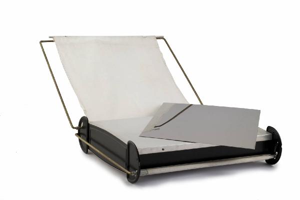 Pressa costituita da un corpo centrale che si riscalda con superficie cromata liscia e due ali laterali incernierate lungo un lato che possono essere aperte per inserire le stampe da asciugare/lucidare. Ciascuna di queste parti apribile è costituita da un telaio in metallo con, all'interno, un telo bianco.\nDa un laot fuoriesce il cavo di alimentazione per il collegamento alla rete elettrica.