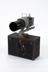 Teleobiettivo di grosse dimensioni e lunga focale montato su un'asta a sezione quadrata e custodito in una valigia in legno rivestita in pelle all'esterno e in velluto all'interno. E' costituito da due telai in metallo uniti da un soffietto in cartone ricoperto in pelle nera rinforzato ai lati da tiranti in metallo. Sopra ai telai è fissato un mirino newtoniano. Sul telaio posteriore è inserito un otturatore a tendina con tempi da 1/25 di sec a 1/2000 di sec e dispositivi d'uso quali scatto e contafotogrammi. Al telaio anteriore è fissato un teleobiettivo Carl Zeiss Triplet 1:5 f=70cm con diaframma a iride. Il diaframma è regolabile agendo su una ghiera posta sull'obiettivo (aperture da f/5 a f/12,5). Il telaio anteriore è fissato ad un'estremità della sbarra, quello posteriore può scorrere agendo su un'apposita rotella. Inferiormente, alla sbarra è fissata una placca che si inserisce in un dispositivo a slitta posto sulla valigia che contiene l'obiettivo e che funge da appoggio per l'uso.\nNella valigia sono contenuti anche un paraluce in metallo che si inserisce a pressione sull'obiettivo, una staffa di sostegno e un otturatore a tendina uguale a quello montato sull'obiettivo, custodito in una scatola in legno ricoperta in pelle e rivestita in velluto all'interno.