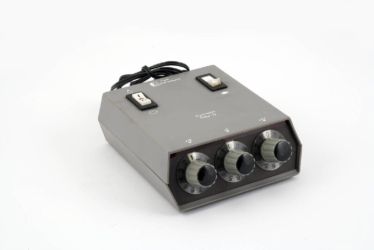 Timer elettronico da tavolo. Sulla parete superiore si trovano due interruttori per la modalità d'uso e l'accensione.\nDi fronte invece si hanno tre selettori rotanti con posizioni da 0 a 11 che permettono di moltiplicare i tempi x10, x1, x0,1.\nDal retro fuoriesce il cavo di alimentazione elettrico.