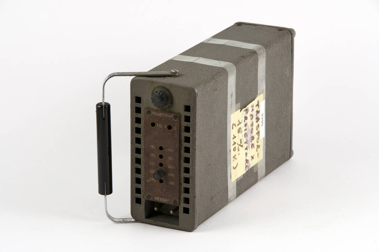 Oggetto di forma parallellepipeda con maniglia per il trasporto e poggiante su quattro piedini antiscivolo.\nNella parte superiore è inserito un porta fusibile, una presa per il collegamento al proiettore e cinque boccole per i collegamenti in entrata con tensioni 130-145V, 145-160V, 200-220V, 220-240V, 240-260V e due boccole per i collegamenti in uscita a 0 e 110V.\nAll'interno del trasformatore si hanno una bobina primaria e una bobina secondaria costituite da un nucleo condiversi avvolgimenti di rame.