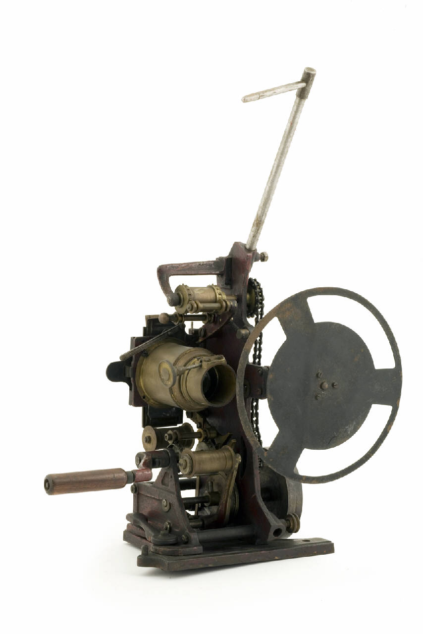 Proiettore cinematografico da tavolo in metallo a sviluppo verticale. E' presente l'apparato di proiezione, manca invece il dispositivo illuminante.\nL'apparato di proiezione, in metallo, poggia su una base quadrata in metallo ed è incernierato ad uno spigolo ed è libero di ruotare lateralmente. E' costituito da un montante verticale al quale sono fissate tutte le parti del proiettore. Da un lato troviamo l'obiettivo con messa a fuco mediante vite senza fine, dietro all'obiettivo è sistemato un telaio quadrato, nel quale si trova la guida verticale per lo scorrimento della pellicola 35mm. Questo telaio presenta una riquadro rettangolare in corrispondenza del punto in cui si posiziona il fotogramma che viene proiettato. Mediante una levetta era possibile regolare la posizione della finestrella del fotogramma. Dietro alla guida andava posizionato il dispositivo illuminante. Sopra e sotto l'obiettivo si trovano cilindri con e senza dentini sui lati, per lo scorrimento della pellicola, collegati ad una croce di Malta ed alla manovella con manico in legno per l'avanzamento manuale della pellicola.\nSull'altro lato del montante si hanno ruote dentate collegate con una catena, un volano, e teste ??????????? per la trasmissione del moto, collegati alla manovella. Su un'asta che termina con un perno a testa ??????? si inserisce l'otturatore rotante posizionato davanti all'obiettivo.\nNella parte superiore del montante si inserisce un'asta ad L nella quale si inserisce la bobina contente la pellicola.