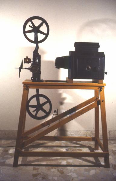 Questo apparecchio cinematografico è costituito da una parte di proiezione e un apparato illuminante.\nLa lampada di illuminazione è costituita da una lanterna in lamiera con camino con illuminazione ad arco voltaico ed alimentazione elettrica. Manca lo specchio parabolico mentre sono presenti gli elettrodi.\nE'mancante anche la lente condensatrice. Porta elettrodi e porta lente condensatrice sono inseriti su guide scorrevoli mediante meccanismo di vite senza fine regolato con manopole situate posteriormente.\nNella parte anteriore è inserito in orizzontale un tubo a forma di tronco di cono chiuso da un tappo removibile.\nLe due parete laterali della lampada sono apribili e forate per permettere l'areazione della lanterna.\nDavanti al tubo della lanterna è inserito il dispositivo meccanico di proiezione costituito da un telaio in ferro al quale sono fissate le due bobine porta pellicola da 35mm. Quella superiore per la pellicola da proiettare, quella inferiore, posta sotto al piano del cavalletto, per avvolgere la pellicola già proiettata.\nLa pellicola avanza grazie a due cilindri con dentini sporgenti posti sui lati che la trascinano e scorre in una maschera posta davanti alla lampada nel punto di passaggio del fascio luminoso.\nDavanti alla maschera è fissato un porta obiettivo cilindrico in metallo con messa a fuoco a cremagliera mediante dispositivo di vite senza fine e un otturatore a farfalla.\nIl dispositivo di avanzamento della pellicola (attualmente non sono presenti nè una manovella nè un motore elettrico) comprende gli ingranaggi e sistemi di trasmissione del moto per la seconda bobina.