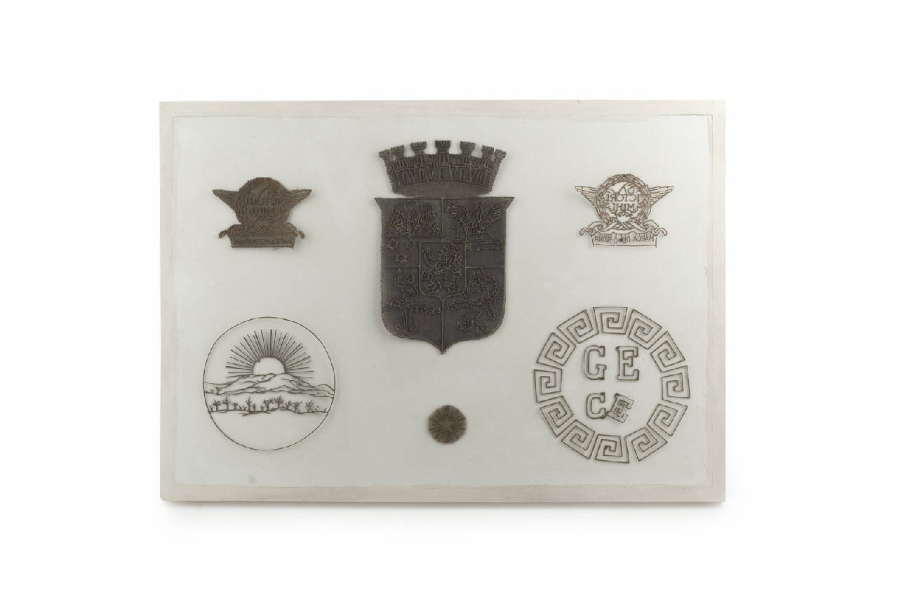 Tavola in legno sulla quale sono applicate sei filigrane a filo.\nTre filigrane sono comprensive della rete metallica sulla quale erano state inserite. Una rappresenta una ghirlanda con ali con la scritta "VICTORIA MIHI" "MARCA DEPOSITATA", la seconda un grosso stemma con corona e vari soggetti, la terza rappresenta una piccola stella con raggi.\nLe altre tre filigrane sono costiuite solo dai fili metallici che costituiscono i disegni: la prima è uguale alla prima delle precedenti, una rappresenta un sole dietro le montagne ed alcuni arbusti in primo piano, la terza le lettere "GE" e "CE" racchiuse entro un motivo geometrico.