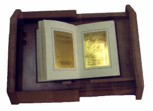 Libro costituito da 56 pagine in carta speciale fabbricata a mano dalle Cartiere Miliani di Fabriano in cellulosa di cotone inalterabile e filigrana con marchio del Libro d'Oro e 20 lamine d'oro 999,9 da 2gr ciascuna.\nLa rilegatura, fatta a mano, è in pelle con incisioni a sbalzo decorate a mano con foglie d'oro zecchino.\nAll'interno della copertina è presente una targa in oro per la dedica personalizzata.\nIl libro poggia su un espositore in legno e plexiglass chiuso con un lucchetto.