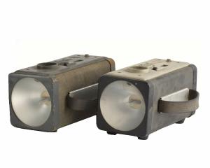 Lampada di forma parallelepipeda con piedini in gomma, foro filettato per l'inserimento su treppiede, maniglia in gomma.\nSulla parete superiore si trovano una presa a otto poli per l'inserimento di una lampada flash, un interruttore di accensione, un connettore per il sincro e un pulsante per sbloccare la parete posteriore apribile.\nAprendo il coperchio si vede il circuito elettrico a valvole di funzionamento e si trova custodita la lampadina da inserire nella presa a otto poli. Lateralmente si ha una presa a tre poli.\nSulla parete frontale è inserita una lampadina a tubo a incandescenza.\nIl bene in oggetto è costituito da due lampade sostanzialmente uguali ma con diverso rivestimento esterno.