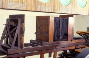 Apparecchio fotografico da studio in legno orizzontale e di grandi dimensioni.\nE' costituito da un porta lastre per formati 40x45cm e un telaio portaobiettivi entrambi in legno, collegati attraverso un soffietto doppio a sezione quadrata in pelle. Nel dorso è inserito un porta lastra con saracinesca in legno. Nel telaio frontale, l'obiettivo è montato su un telaio in legno con regolazione sia orizzontale che verticale. L'obiettivo attualmente sull'apparecchio è a doppia lente con diaframma fisso in metallo.\nMediante una doppia cremagliera, azionata attraverso una coppia di rotelle posizionate lateralmente al porta lastra, era possibile avvicinare o allontanare dorso e frontale permettendo così la messa fuoco. Inoltre un dispositivo con vite senza fine azionato mediante una manovella, permetteva un'ulteriore scorrimento dei due telai in legno sul piano del cavalletto su cui poggia l'apparecchio.\nAll'estremità opposta del cavalletto, di fronte all'obiettivo, è inserito un sostegno in legno su cui poggia una tavola anch'essa in legno sulla quale veniva fissata l'immagine da riprodurre. Questa tavola poggia su un dispositivo a slitta che può scorre longitudinalmente rispetto all'apparecchio fotografico, aumentando o diminuendo l'entità dell'ingrandimento.\nIl cavalletto poggia su quattro rotelle e la parte superiore termina con due manglie per una più semplice impugnatura durante gli spostamenti.