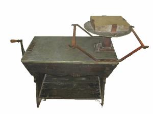 Piccolo tavolo in legno rettangolare, con il piano ricoperto in metallo. Ad un'estremità del piano è fissato un sostegno sul quale è disposto un disco rotante in metallo. Sul disco poggia una pietra litografica rettangolare tenuta in posizione da fermi in metallo. Sotto al piano è presente una sbarra in ferro che può ruotare azionata da una manovella posta su un lato e che, all'altro capo, termina con una ruota dentata. La ruota dentata trasferisce il moto rotatorio, mediante un ingranaggio a tronco di cono, ad un'asta verticale contenuta nel sostegno verticale del disco.