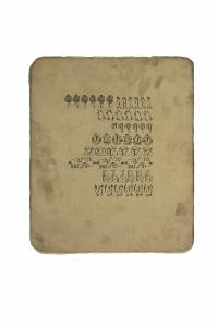 Pietra calcarea con superfici levigate e pareti ruvide. Le due superfici liscie sono litografate. Su una faccia sono presenti composizioni floreali, sull'altra decorazioni floreali disposte in righe.
