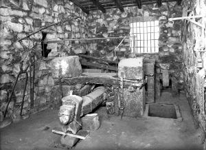 Maglio idraulico. Il maglio è costituito da un grosso martello dotato di testa (maì) in ferro e manico (mànech) in legno, quest'ultimo suddiviso in capo (co) e coda (cua). Sulla testa del maglio è applicato uno dei due elementi battenti (bóche) in ferro; l'altro è applicato alla struttura in ferro parzialmente sotterrata (masèta) che funge da incudine. Sulla coda del manico è applicata la penna (pèna), un cuneo in legno avente lo scopo di agganciare le traversine applicate sull'albero di trasmissione.\nIl manico del maglio è incernierato ad una incastellatura di pietra e legno, tramite un sostegno in ferro. Tale sostegno ha la forma di un anello (boga) dal quale partono due "corna" (corègn) che si vanno a inserire su due pali (pài) in ferro che corrono paralleli al manico. L'incastellatura è composta da due grosse pietre (sòche) e una serie di assi in legno poste parallelamente al manico, che hanno lo scopo di sostenere i pali, e da quattro grosse travi di legno (tràf) poste perpendicolarmente al manico, due sopra e due interrate sotto lo stesso, che hanno lo scopo di tenere insieme l'incastellatura.\nIl maglio è azionato meccanicamente grazie ad un albero di trasmissione (èrbor) in legno che lo collega a una ruota idraulica. Sull'albero sono disposti una serie di cerchi in ferro; alcuni hanno lo scopo di impedire i movimenti del legno dell'albero (ghere o anèi), altri (tamburì) stringono all'albero le traversine (treèrse) che, battendo la coda del maglio, ne sollevano la testa. \n\nCorredano l'oggetto: \n- una ruota idraulica\n- un sistema in grado di governare l'acqua (necessaria per il funzionamento e il mantenimento del maglio, nonche delle lavorazioni di fucinatura). La quantità di acqua che muove la ruota idraulica e, di conseguenza, il maglio può essere essere controllata attraverso un deviatore (acquaröl) comandato da una pertica-leva (stanga) con blocco a fori, posta alla prossimità destra della testa del maglio. Un sistema di canalette (canalète) permette inoltre di mantenere il maglio bagnato e di far arrivare acqua alla vasca di raffreddamento (pilòt) posta vicino a una delle due pietre dell'incastellatura.\n- alcuni attrezzi (12) da lavoro come pinze e tenaglie, usati per lavorare al maglio o realizzati con lo stesso.