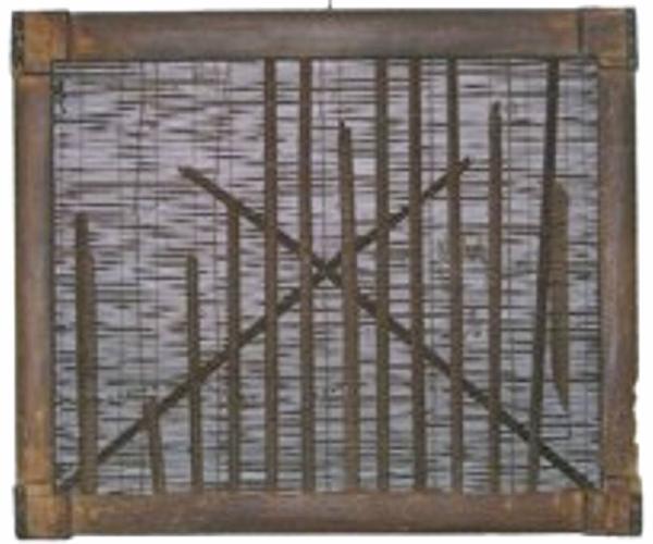 Telaio rettangolare in legno sul quale è fissata una rete in fili di metallo molto sottili che formano la tela filigranatrice. Su questa rete, che funge da setaccio, sono ricamati con un filo metallico un disegno non decifrabile e la lettera "A" in corsivo, che realizzano una filigrana in chiaroscuro.\nSul retro è presente una struttura di vergature in legno in senso verticale e lungo le due diagonali. Qesta vergatura è molto rovinata. Sul telaio è appoggiata (e incastrata) una cornice in legno con rinforzo in ottone (cascio).