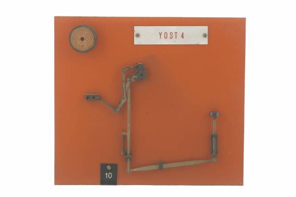 Cinematismo costituito da cinque elementi in acciaio, comprendenti la leva del tasto, il tirante e il martelletto portacaratteri. Il martelletto batte sul rullo con un movimento a cavalletta. Il bottone del tasto, in gomma dura nera, è sistemato su un'asta che preme sulla leva. Il movimento di ritorno del tasto è guidato dalla molla a torsione agente sul tirante. Il cinematismo è fissato ad un pannello in bachelite.