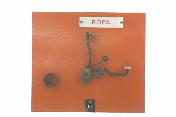Cinematismo costituito da due elementi in acciaio, comprendenti la leva del tasto, il tirante curvo e il martelletto portacaratteri. Il bottone del tasto è in in metallo, ricoperto da un disco di celluloide trasparente. Il movimento di ritorno del tasto è guidato dalla molla a torsione posta nella parte finale della leva. Il cinematismo è fissato ad un pannello in bachelite.