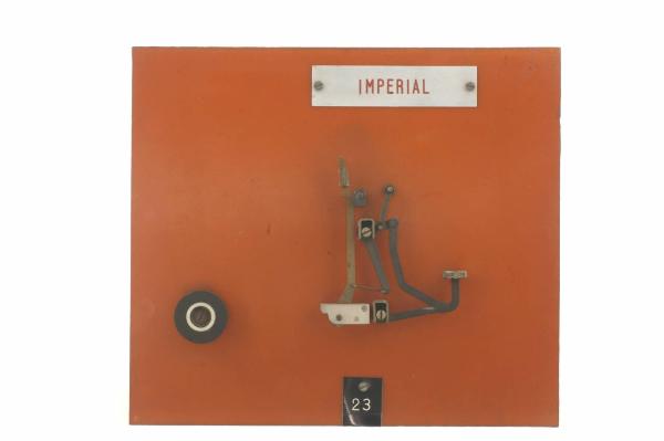 Cinematismo costituito da due elementi in acciaio, comprendenti la leva del tasto e il martelletto portacaratteri. Il bottone del tasto è in metallo, ricoperto da un disco di celluloide trasparente. Il movimento di ritorno del tasto è guidato dalla molla a torsione agente sul martelletto. Il cinematismo è fissato ad un pannello in bachelite.