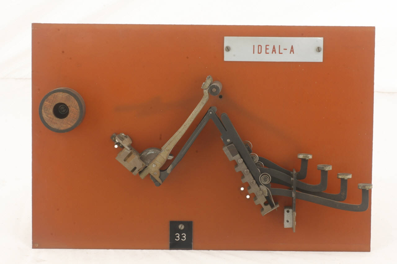 Cinematismo costituito da un sistema di leve formato da tre elementi in acciaio, comprendenti la leva angolare del tasto, il tirante e il martelletto portacaratteri. Il bottone del tasto è in ebanite, ricoperto da un disco di celluoide trasparente. Il movimento di ritorno del tasto è guidato dalla molla a spirale piatta posta nella parte angolare della leva. Sul pannello in bachelite è fissata una sezione di macchina per scrivere che comprende i cinematismi di quattro tasti.