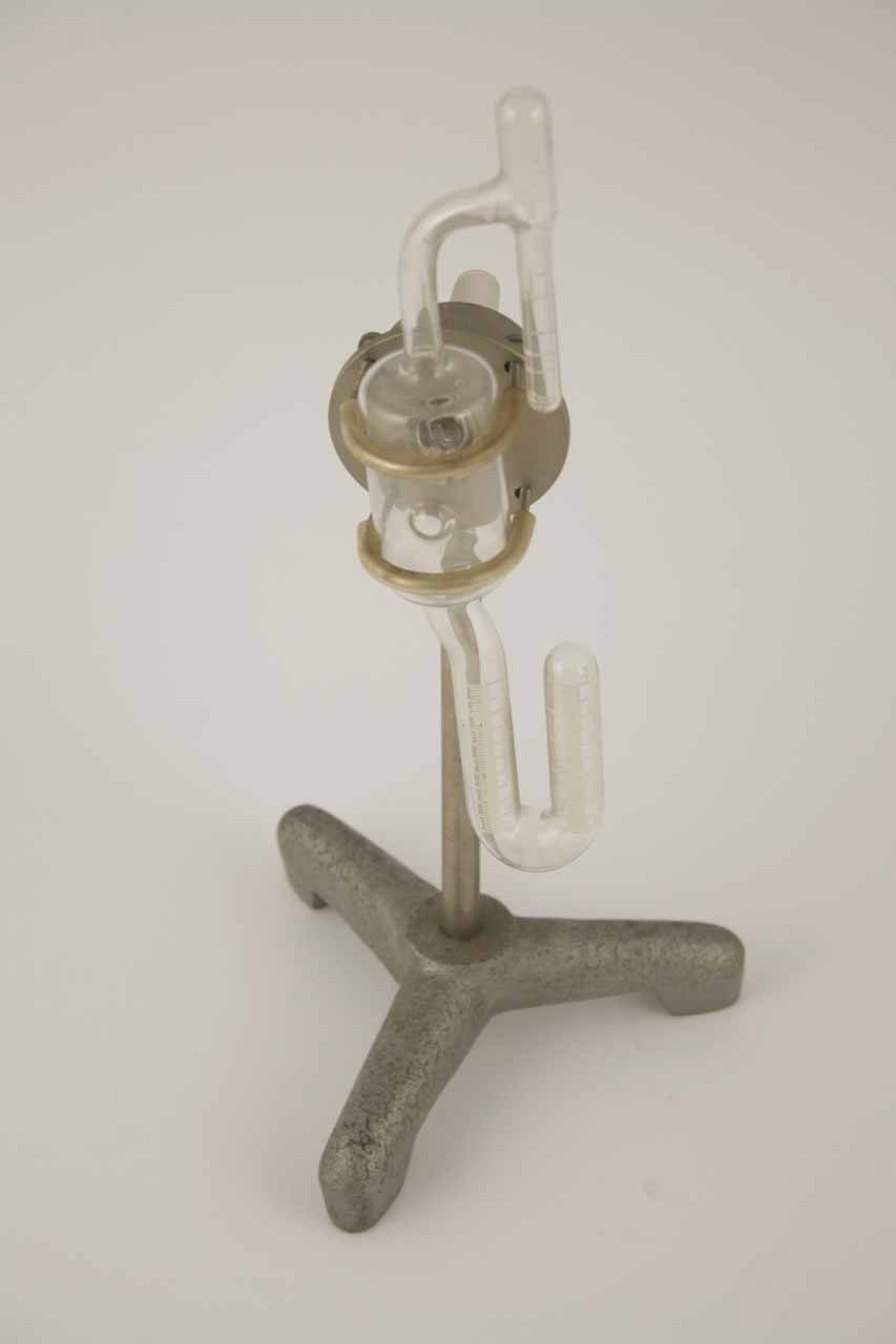 Vacuoscopio in vetro, sostenuto da una struttura in metallo con base a tre gambe. Lo strumento è costituito da un'ampolla cilindrica in vetro, fissata con due sostegni alla struttura in metallo, con cono maschio orizzontale. L'ampolla si divide poi in due tubi in vetro ripiegati per due diversi campi di misura: uno va verso l'alto e presenta una scala graduata non lineare 001, 005, 01, 02, 05, 1, 2, 3, l'altra va verso il basso ed è ripiegata ad U e su ciascuno dei due rami presenta una scala graduata lineare da 0 a 5 con suddivisioni ogni 0,1.