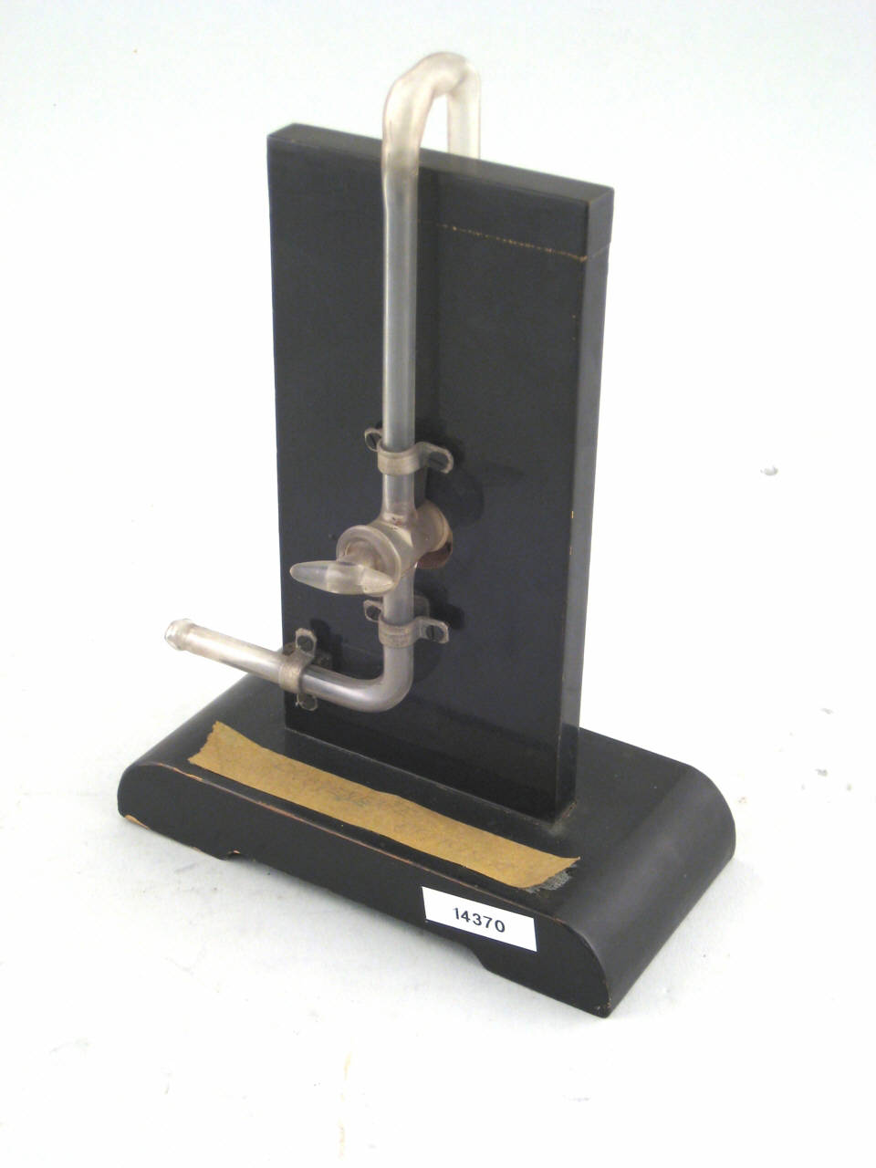 Vacuometro fissato su una struttura in legno. E' costituito da un tubo in vetro aperto ad un'estremità con un rubinetto anch'esso in vetro. Il tubo gira, dall'alto, attorno al sostegno in legno. Nell'estremità del tubo è inserito un altro tubo in vetro più largo nella parte bassa fissata alla base. All'interno di questa parte è inserita un'ampolla in vetro contenente mercurio.\nSul sostegno verticale, dietro l'ampolla è fissato uno specchietto rettangolare.