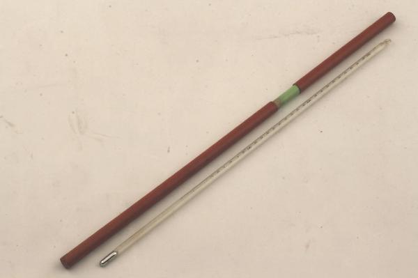 Termometro costituito da un tubicino in vetro con testa in metallo e anello per appenderlo. All'interno del tubo è inserito un tubo capillare nel quale scorre il mercurio.\nParte della superificie interna del tubo è colorata di bianco per facilitare la lettura della temperatura. Sul vetro è stampata una scala graduata da 0 a 300 Gradi Centigradi con indicazioni numeriche ogni dieci e tacche ogni unità.\nIl termometro è inserito in una custodia cilindrica in cartone.