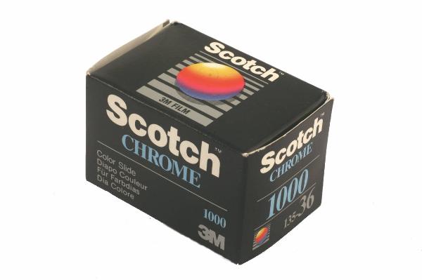 Rullino di pellicola fotografica 35mm per diapositive a colori. Il rullino è contenuto in un cilindro in plastica con tappo, a sua volta inserito in una scatoletta in cartoncino riportante i dati tecnici della pellicola e il marchio del produttore. Il rullino è in metallo e contiene al suo interno la pellicola da impressionare arrotolata attorno ad un fuso centrale che può ruotare. Una linguetta di pellicola fuoriesce dal rullino.\nLa pellicola è una Scotch Chrome con pellicola 3M da 36 esposizioni con sensibilità 1000ASA.