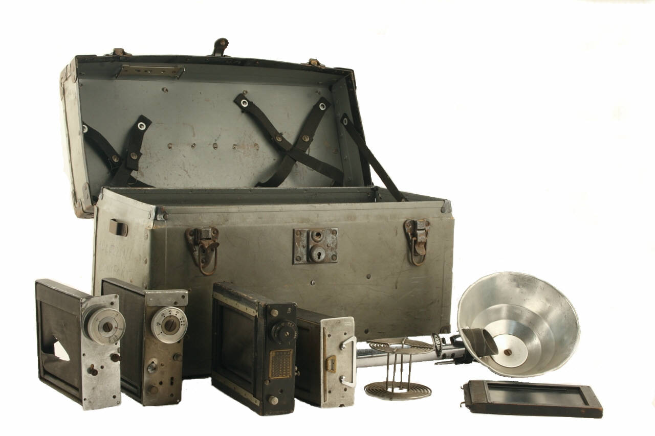 Valigia in materiale plastico e metallo. Con coperchio apribile, serrature e maniglia in cuoio.\nAll'interno della valigia si hanno parti di un flash a lampada, un magazzino portalastre, tre otturatori a tendina, numerosi porta lastre e pellicole di diverso formato.\nIl magazzino porta lastre, in metallo, è costituito da un contenitore nel quale si inseriscono le lastre fotografiche con la parete dalla parte dell'apparecchio, apribile. All'interno si ha un pressore che tiene la lastra da impressionare in posizione.\nGli otturatori sono a tendina avvolgibile con carica a molla. In un telaio in metallo è inserita la tendina, avvolta da un lato. Di fianco si hanno i comandi di scatto, di selezione della velocità, di carica.\nLa lampada flash è costituita da un'asta con innesto per l'apparecchio fotografico e una parabola con due spinotti di inserzione e con superficie concava riflettente.\nI porta lastre e pellicole sono singoli e doppi. In metallo o in materiale plastico. Di formati da 9x12cm a 10x12cm.