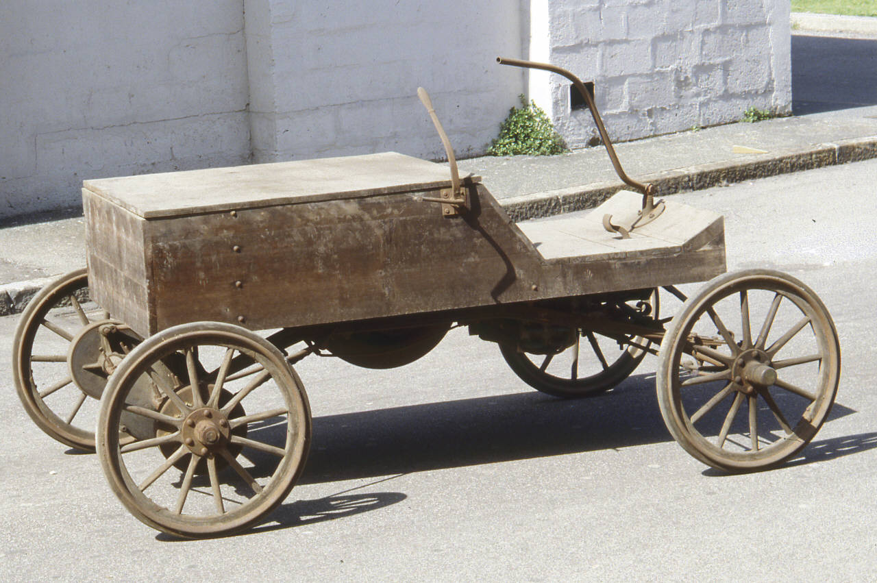 Autovettura con corpo in legno a pianta rettangolare, non verniciato. Il corpo in legno presenta due piani, collegati medianti una superficie inclinata; la parte anteriore, più bassa, ospita il posto di guida, mentre la parte posteriore ha una forma a parallelepipedo. Il corpo del veicolo poggia su due lunghe sospensioni a balestra longitudinali, fissate agli assi delle ruote; l'avantreno, inoltre, comprende un ulteriore ammortizzatore a balestra collegato direttamente alla leva di sterzo. Le ruote presentano cerchi e raggi in legno e gomme piene. Il motore è posizionato al di sotto del corpo del veicolo ed è costituto da un solo cilindro, con trasmissione a catena sulle ruote posteriori; la manovella per l'accensione del motore è collocata lungo il fianco destro dell'automobile. La vettura è dotata di un sedile mobile in legno a sezione trapezioidale. Il posto di guida è dotato della leva dello sterzo e di un solo pedale, sistemato nella parte destra del piano dell'abitacolo.