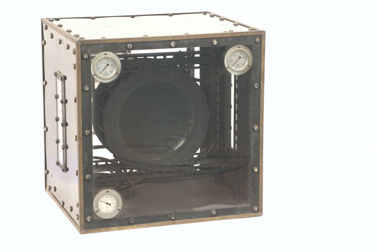 Dispositivo di forma paralleleepipeda, con pareti in materiale plastico trasparente, parzialmente verniciato di nero. All'interno della camera si inseriva una miscela di gas e vapore acqueo. Oltre alla scatola è presente un pistone scorrevole. Alla camera sono collegati tre contatori Geiger, uno sopra e due sotto. Tra i due contatori sotto è presente uno strato in piombo.\nUna parete è apribile.\nSulla parete opposta a quella apribile si hanno i quadranti di due manometri e un termometro collegati alla camera. I manometri permettono misure di pressione da 0 a 0,5 kg/cm2, il termometro di temperature da 0 a 40°C.