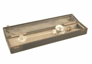 Termometro costituito da due ampolle in vetro a forma di goccia, unite da un cannello sul quale è dipinta a mano, con puntini di smalto, una scala suddivisa in sei settori ciascuno suddiviso in dieci parti uguali (puntini neri per i gradi e bianchi per le decine). Il liquido termometrico è acquarzente.\nIl termometro è conservato in un astuccio in legno ricoperto in tessuto ed imbottito internamente.