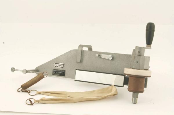 Basamento in metallo con due morsetti per il fissaggio. Lateralmente è fissata una manovella che fa ruotare un calorimetro in rame. Dalla parte opposta rispetto alla manovella è presente un foro per l'inserimento del termometro (mancante). Sotto al calorimetro uno specchietto orientabile viene utilizzato per la lettura delle temperature senza errore di parallasse.\nAttorno al calorimetro scorre una fascia in tessuto (probabilmente Nylon) vincolata, ad un capo, al basamento mediante un'asta e una molla e libera all'altro capo. Da questa parte termina con un anello in metallo utilizzato per appendere un peso (mancante).