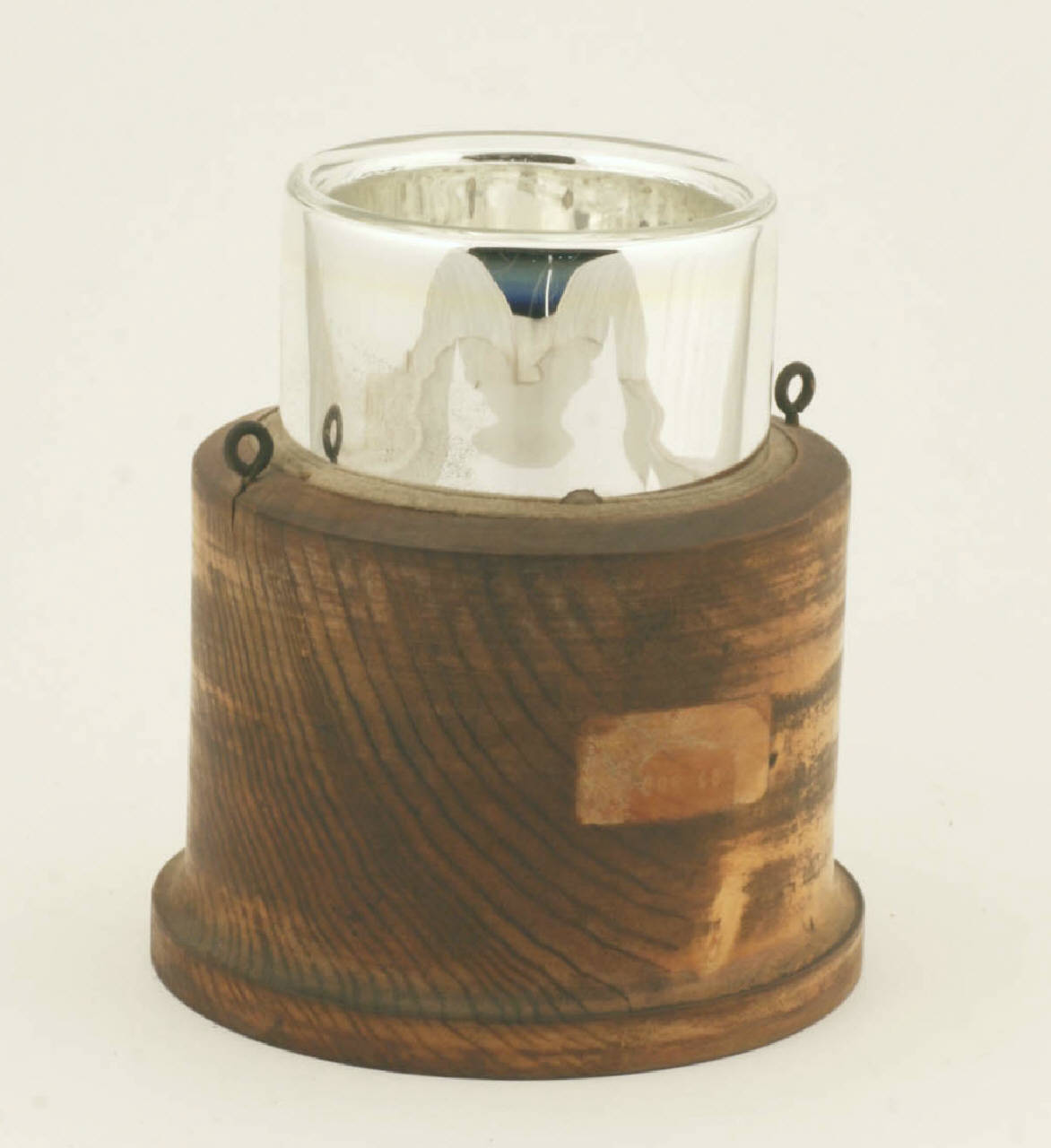Vaso in vetro specchiato parzialmente inserito un un cilindro in legno ricoperto internamente in feltro. In due punti del cilindro in legno sono inseriti due piccoli anelli in metallo.