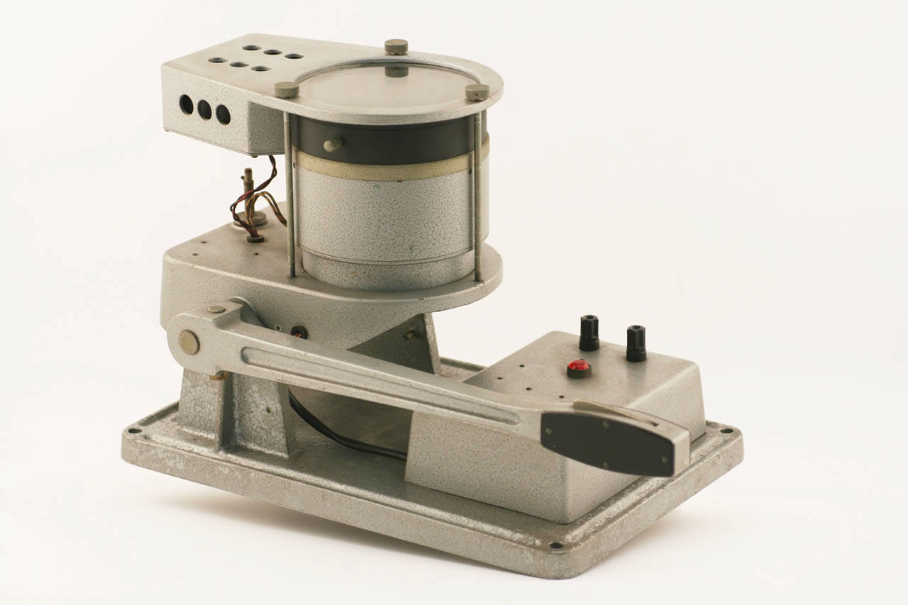 Camera cilindrica in metallo con coperchio in vetro trasparente. La base inferiore è costituita da uno stantuffo collegato con una leva posta lateralmente. Il funzionamento della leva è sincronizzato con l'emissione delle particelle ionizzanti.