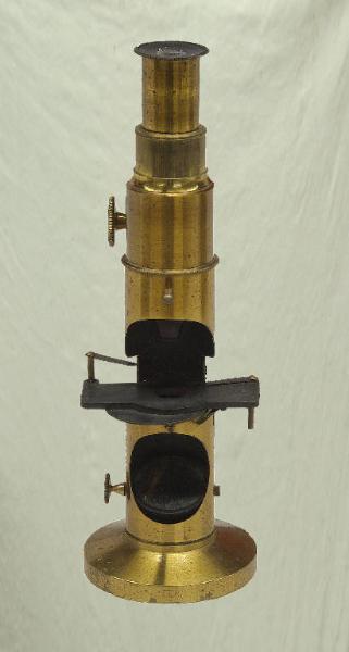 microscopio in ottone con base d'appoggio circolare, completo di scatola di custodia in legno contenente una lente di scorta dell'oculare.