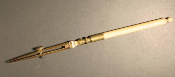 asticciola in avorio a sezione circolare con pomolo all'estremità superiore. Al centro impugnatura in ottone tornito che forma corpo unico con il pennino trapassato da una vite in ottone.