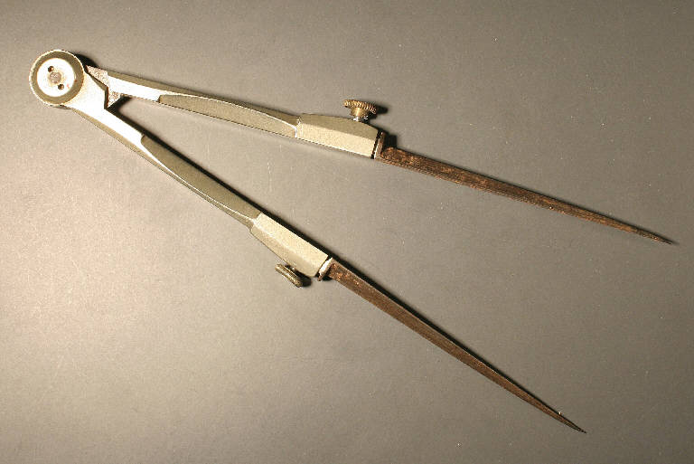 Compasso rapportatore a punte mobili: impugnatura superiore in alluminio con testa tonda. Due viti laterali per il fissaggio delle punte mobili in acciaio a sezione triangolare.