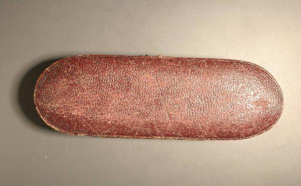 astuccio di forma ovale con rivestimento esterno in similpelle marrone scuro e interno in velluto blu. Chiusura con 1 gancetto sul davanti. Lunga cerniera posteriore.