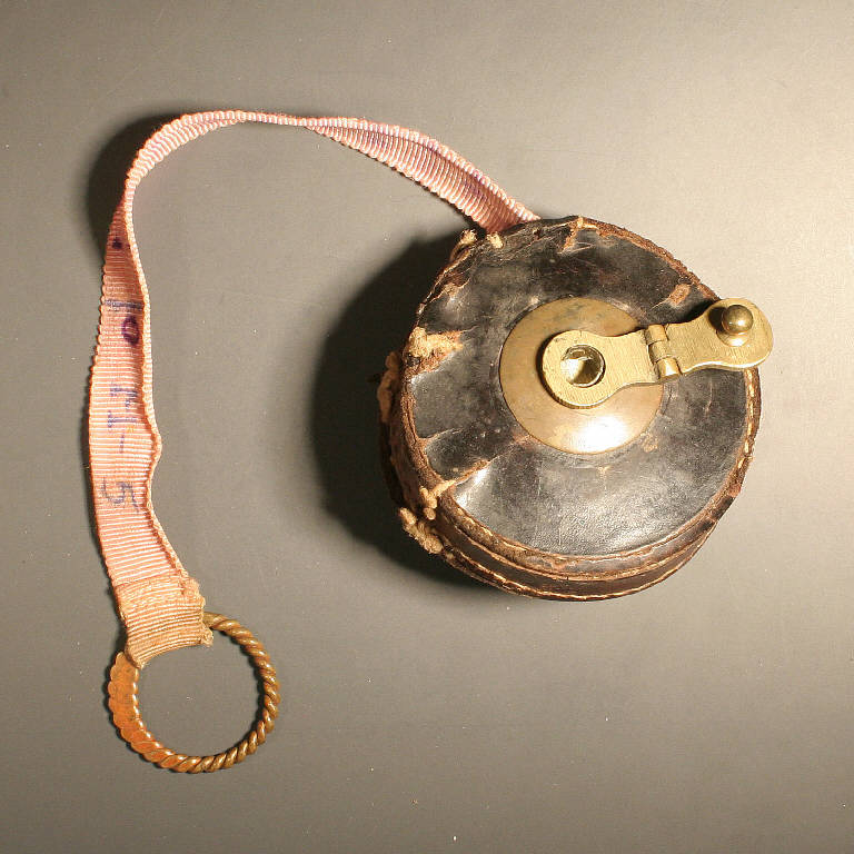 Custodia tonda in cuoio cucito a mano con 5 punti in corda di riparazione esterna. Perno a manovella ripiegabile in ottone per il riavvolgimento. La corda di misurazione avvolta all'interno è in tela cerata di colore arancione. La parte iniziale è costituita da una fettuccia di cotone rosa numerata a mano in inchiostro viola per una lunghezza di cm. 34 ed è munita di un anellino in ottone ritorto.