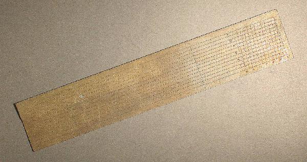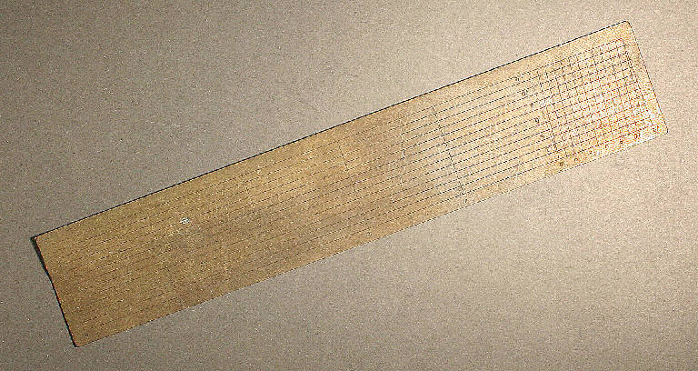 righetto in ottone con incisioni su entrambi i lati: righe verticali numerate a 1 a 5 ogni cm. 2,50 e quadrettature da mm. 2 numerate da 1 a 10 su un lato e da 2 a 12 sull'altro.