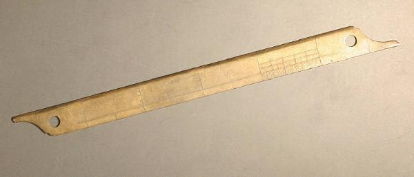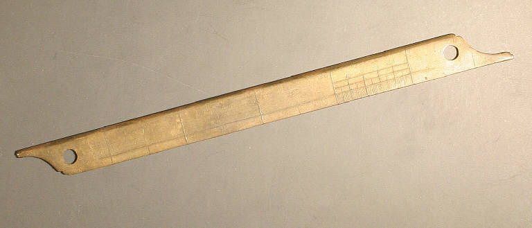 righetto rettangolare in ottone, entrambe le estremità sono sagomate a becco e recano un foro. Da un lato il righetto è quadrettato con 4 incisioni di cm. 2 di lunghezza. Un riquadro risulta ripartito all'interno di ulteriore quadrettatura suddivisa in cm. 2, cm. 1, e mm. 10