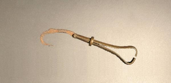 punta piatta, acuminata e ricurva, in acciaio, imperniata ad una estremità di un fermaglio a due bracci in ottone munito di un anello scorrevole che funge da fermo.