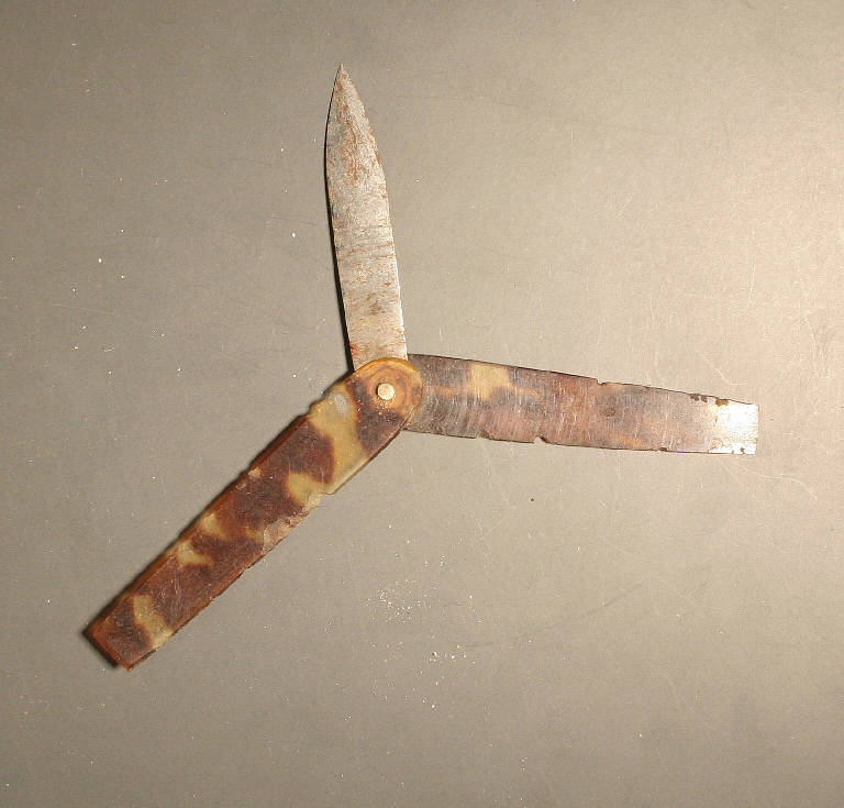 piccola punta estraibile, piatta e acuminata, in acciaio, imperniata con un unico chiodino in ottone a due corti segmenti in tartaruga, che servono sia da impugnatura che da custodia.