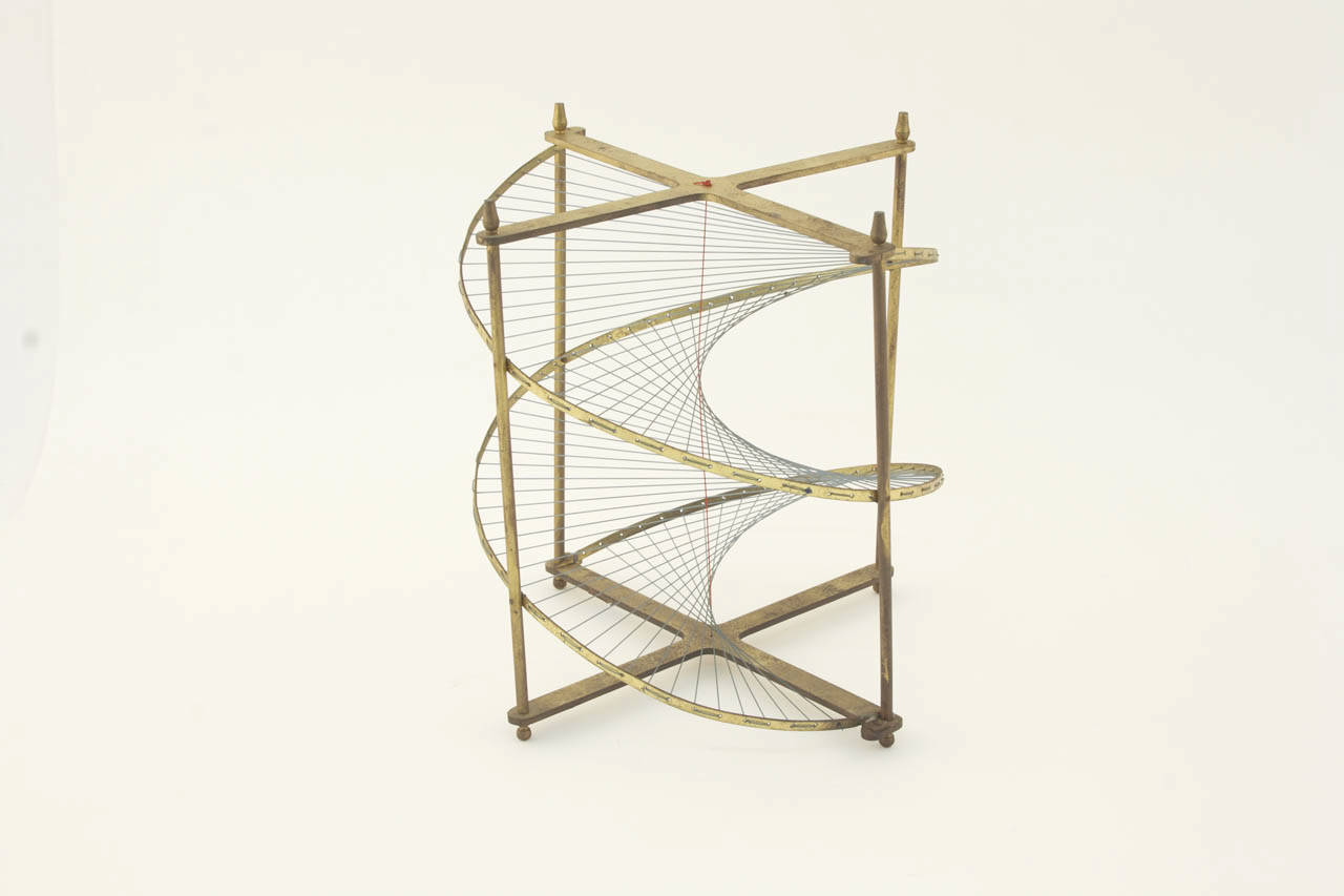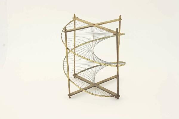Un filo di nylon blu, intelaiato su un castello in ottone, raffigura lo sviluppo della superficie che il modello vuole rappresentare. Si tratta di una superficie generata dal movimento elicoidale uniforme (superficie elicoidale o elicoide) di una retta (da qui "rigato") che incontra l'asse dell'elicoide (quindi "chiuso") e che è perpendicolare a detto asse (perciò "retto"). Un altro filo di nylon, di colore rosso, rappresenta l'asse dell'elicoide.
