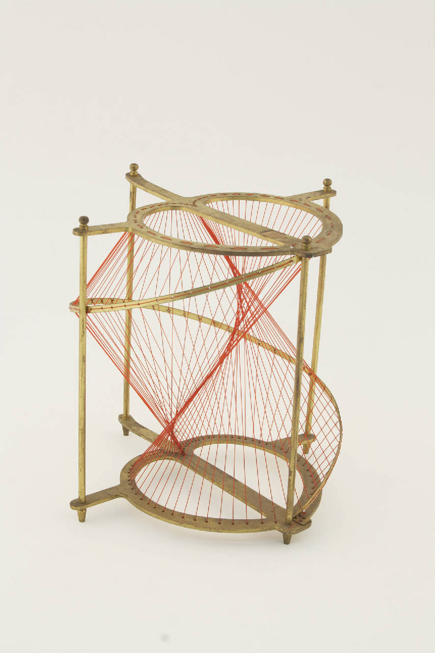 Un filo di nylon rosso intelaiato su un castello in ottone raffigura lo sviluppo della superficie che il modello vuole rappresentare. Si tratta di una superficie generata dal movimento elicoidale uniforme (superficie elicoidale o elicoide) di una retta (da qui "rigato") tangente ad esso, che quindi non incontra l'asse dell'elicoide (quindi "aperto"), e che non è perpendicolare a detto asse (cioè "obliquo").\nL'elicoide sviluppabile è un caso particolare di elicoide rigato aperto obliquo.