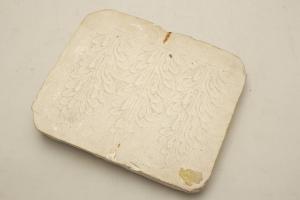 Forma in gesso con riprodotta un'immagine in negativo. Questa forma è contenuta con altre in gesso e in legno in una bacheca chiusa da un vetro.