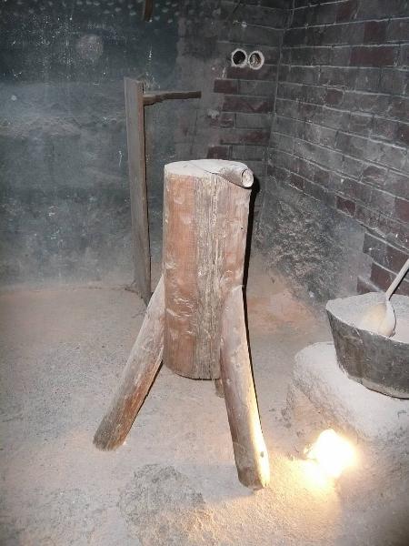 Ceppo in legno sorretto da quattro gambe inchiodate ad esso. Sopra al ceppo è fissata una taglierina costituita da una lama e un manicotto nel quale si poteva inserire il manico.