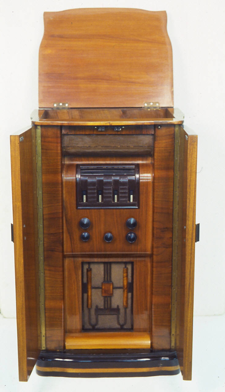 Mobile in legno e radica con due ante apribili sul fronte e un coperchio apribile.\nLa parete frontale è occupata dai comandi del radioricevitore e dall'altoparlante, sotto al coperchio invece si trova il giradischi.\nIl radioricevitore comprende un indicatore di sintonia, una scala di sintonia per onde corte, medie e lunghe con indice alfabetico delle città e cinque manopole per la regolazione di volume, sensibilità, fedeltà/selettività e per la selezione del fonografo.\nSotto a questi comandi si hanno una tela grigia e una griglia in legno e metallo a protezione dell'altoparlante (mancante).\nIl giradischi è costituito da un piatto girevole in plastica e un braccio rotante in metallo vincolato nella parte posteriore e appoggiato su una piccola staffa.\nIl retro è aperto e sono visibili il circuito supereterodina con stadio RF a 7 valvole, il circuito del giradischi, manca invece l'altoparlante.