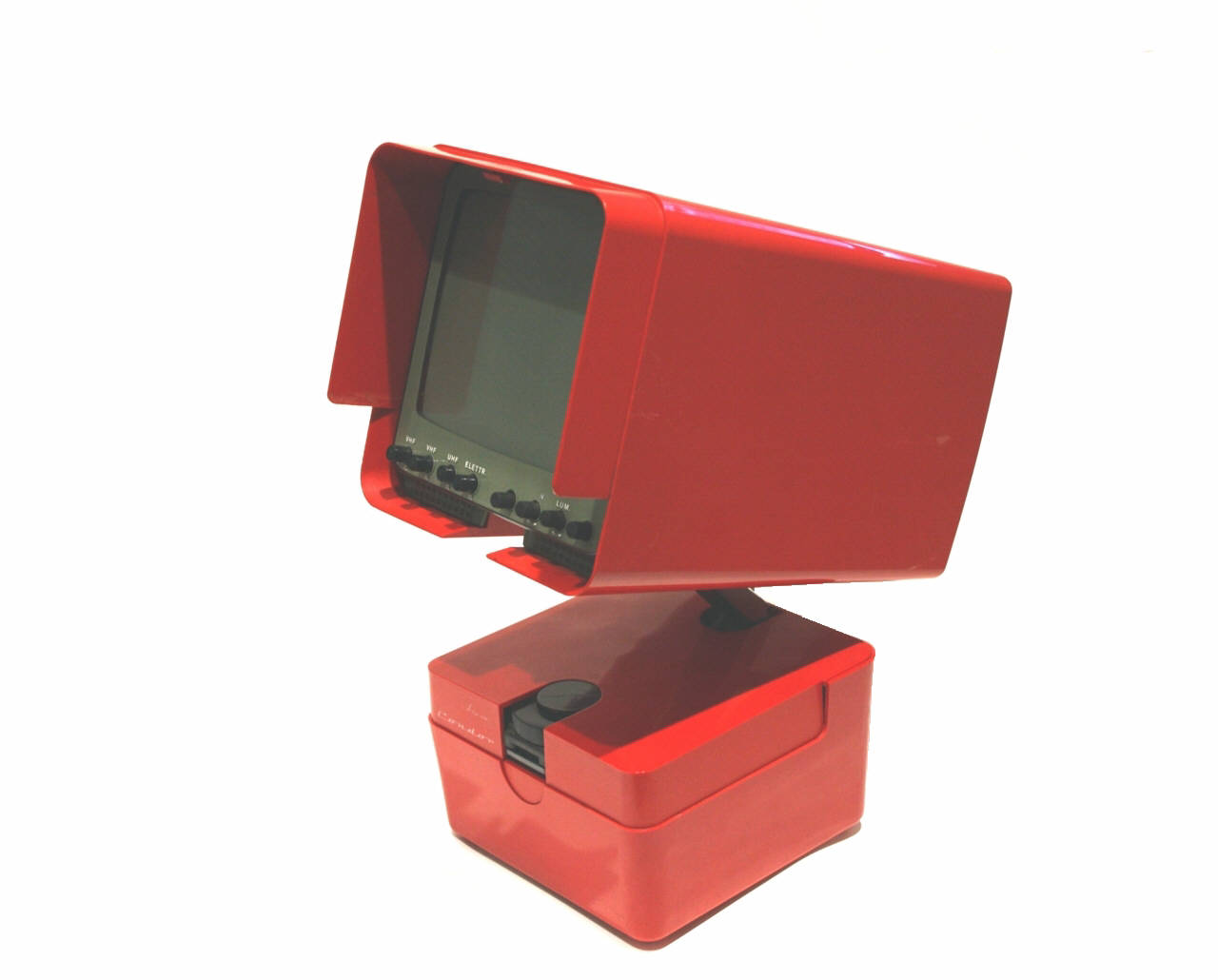 Apparecchio in materiale plastico ABS rosso costituito da due parti, una base e una scocca contenente il cinescopio collegate mediante un'asta in metallo che permette la variazione dell'angolazione della parte superiore. La parte superiore, ha anche una maniglia estraibile in metallo nella parte posteriore.\nLa parete frontale della parte superiore è occupata dallo schermo, con paraluce in plastica.\nSotto allo schermo si hanno 4 tasti per la selezione delle bande con le indicazioni VHF, UHF, UHF, ELETTR e 4 manopole per la regolazione di contrasto, luminosità e, probabilmente, volume e toni (le due scritte sono illeggibili).\nEstraendo la maniglia sul retro si accede a due dispositivi di regolazione della sincronia verticale e orizzontale e ai connettori per le antenne.\nAll'interno si hanno il circuito a transistor con diodi a cristallo e raddrizzatori metallici per funzioni di valvole pari a 123 e un altoparlante magnetodinamico circolare.\nDalla base fuoriesce il cavo di alimentazione alla rete elettrica.\nRuotando la parte superiore si può chiudere in un solo blocco autoproteggendo comandi e cinescopio per il trasporto.