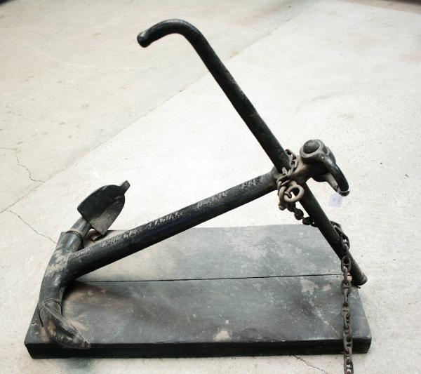 Ancora di tipo Ammiragliato, a marre fisse e ceppo mobile, fissata su una tavola di legno. Il fuso, a sezione circolare, presenta all'estremità superiore un maniglione imperniato per il collegamento alla catena di ormeggio. In un foro praticato sul collo del fuso è infilato il ceppo mobile, costituito da un'asta con un'estremità ricurva. Il ceppo è tenuto fermo, da una parte da un dente, situato a metà circa della lunghezza, che ne blocca lo scorrimento nel foro e, dall'altra, da una chiavetta; le parti terminali del ceppo, inoltre, presentano due bottoni per impedire il completo sfilamento dal foro. Il fuso presenta un ingrossamento nell'estremità inferiore, chiamato diamante, dal quale partono, in direzione normale rispetto al ceppo, le due marre dotate di patte lanceolari.
