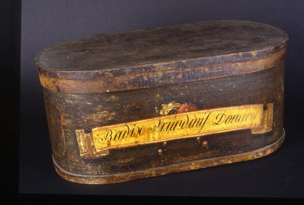 la scatola ha forma ovale con coperchio in legno. Il coperchio è profilato da un listello sporgente che si ripete alla base, con chiara funzione non solo decorativa.