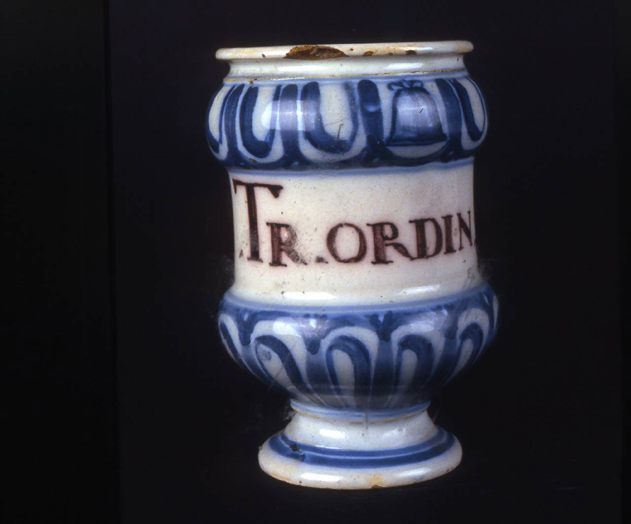 Vaso a rocchetto, forma comunemente denominata albarello, con struttura tipica settecentesca con alto piede piano svasato, spalla arrotondata collo cilindrico, breve con larga imboccatura ad orlo estroflesso.